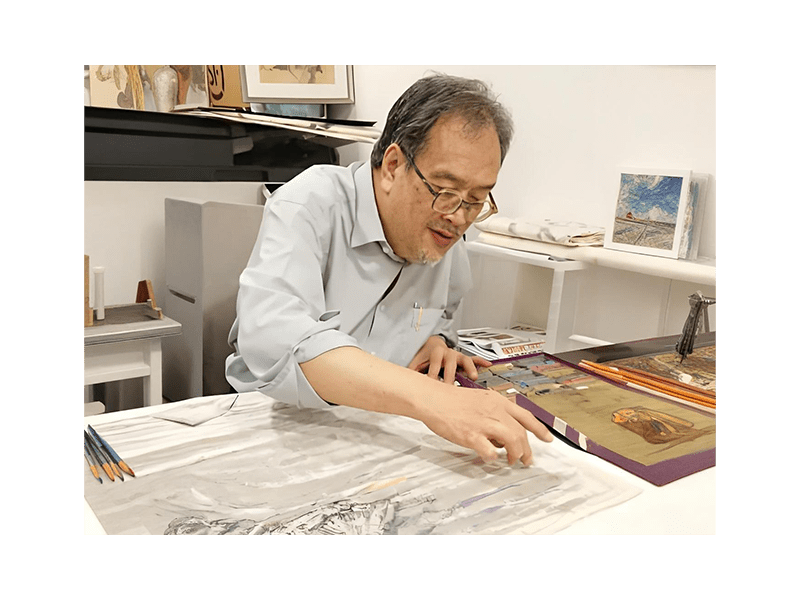 2019 年成为金嘉伦教授的门下。他本身擅长水彩画,在金教授师傅的影响。近年作品揉合了中国笔墨线条的风格,创作了一系列墨彩意象作品。